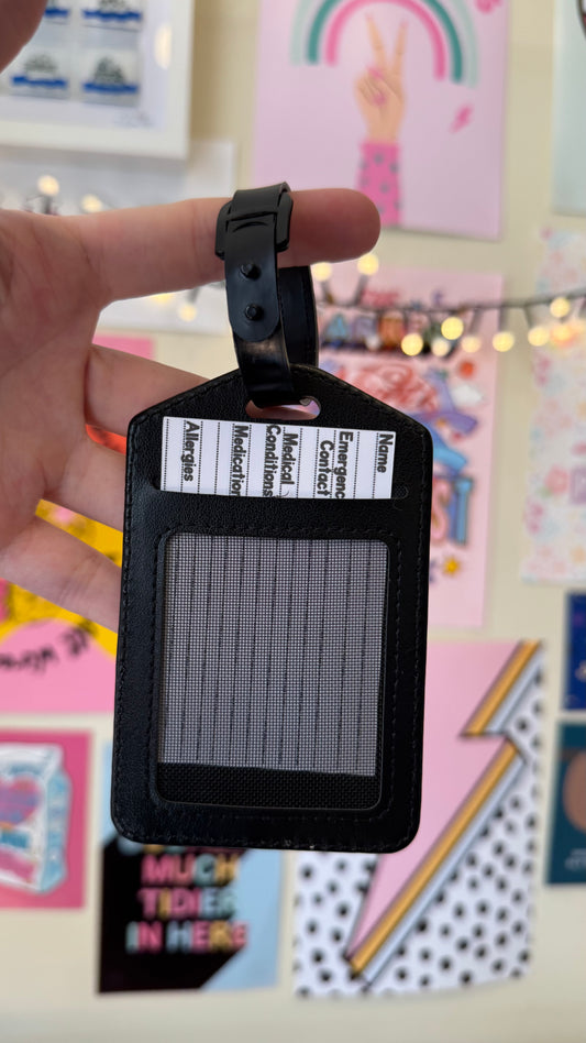 Medical buggy bag tag “please treat as a wheelchair- my buggy keeps me safe”