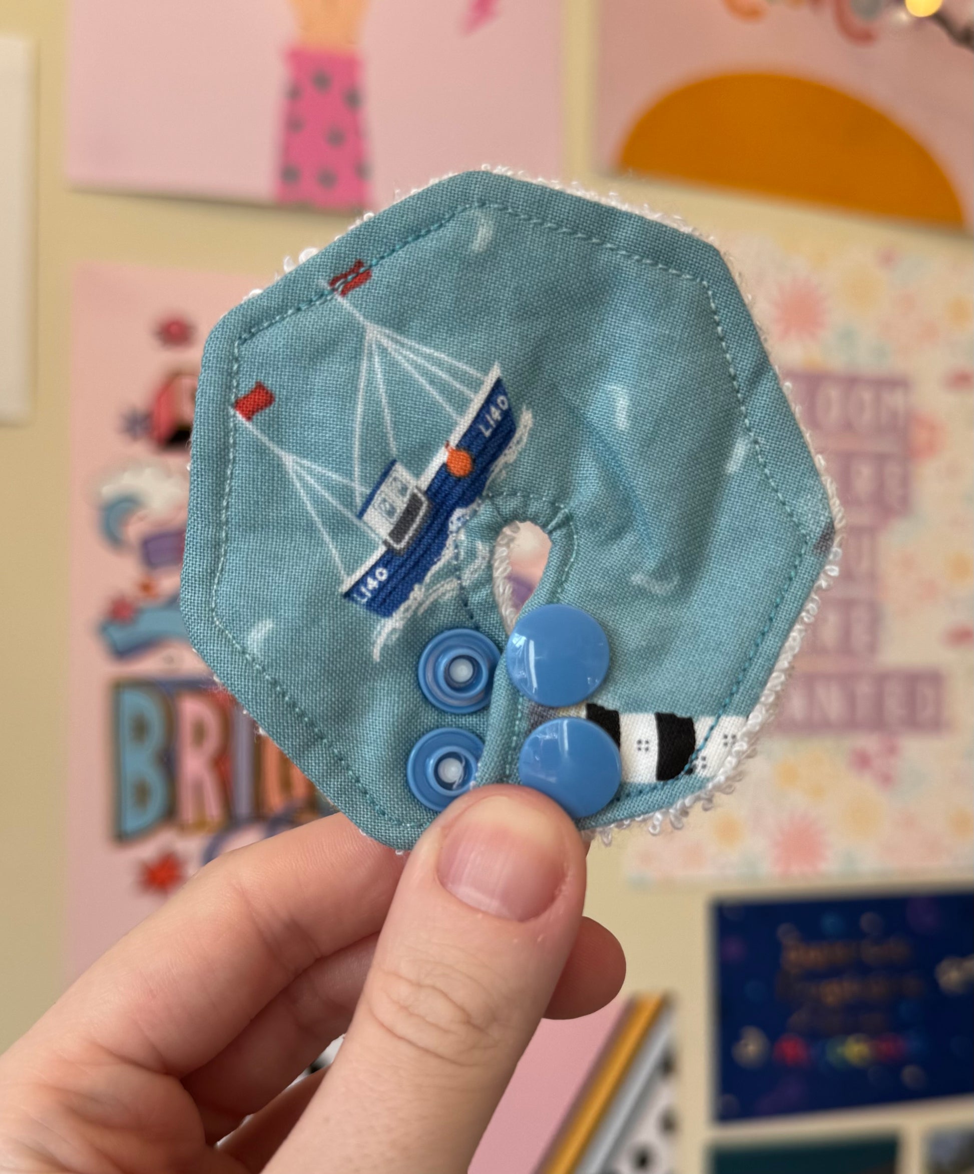 - the extra secure Tubie pads have a extra fastening button so a total of two buttons snaps to clip in to place this means that’s the fabric has less places to move and the fabric is more flush and secure around the tube reduce the rubbing and risk of granulation tissue! I also find if you need to put cream on your stoma the cream stays around the sight and does not end up on the outside bumper or clothes!
