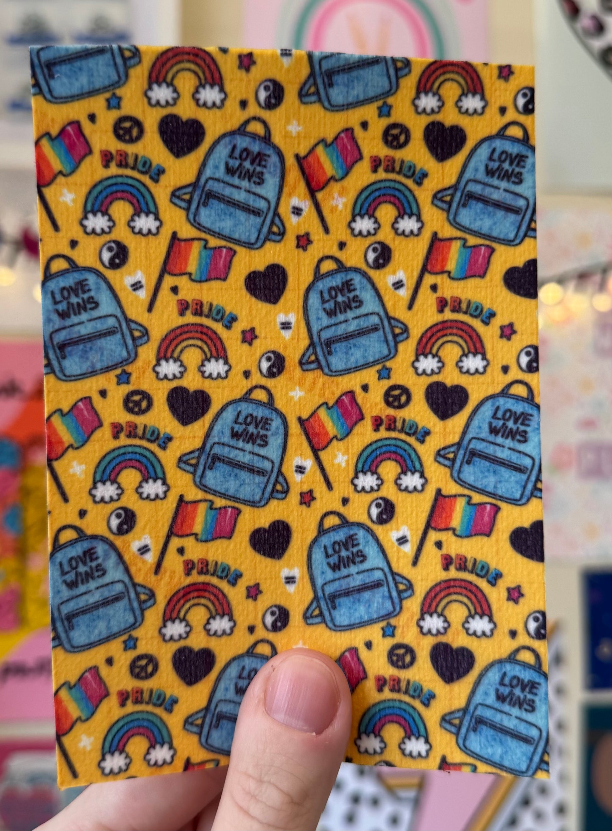 Love wins bags, pride flags on yellow LGBT pride 2025 Tubie tape